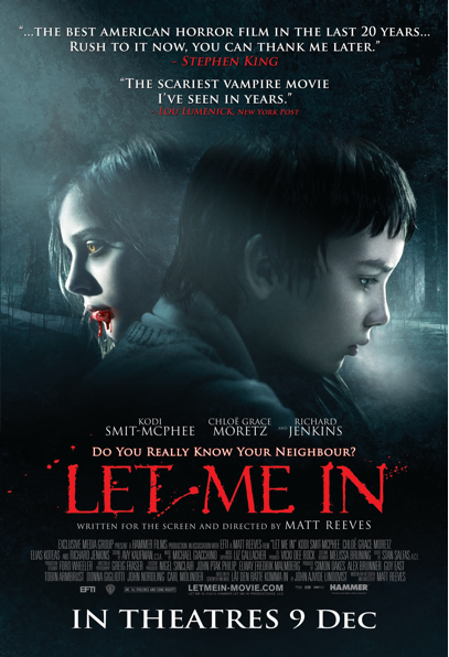 Let Me In ist ein Remake eines schwedischen Films, den ich nicht gesehen habe. Ich habe gelesen, daß sich das Remake recht eng an die Vorlage hält und daß viele Leute es für überflüssig halten.